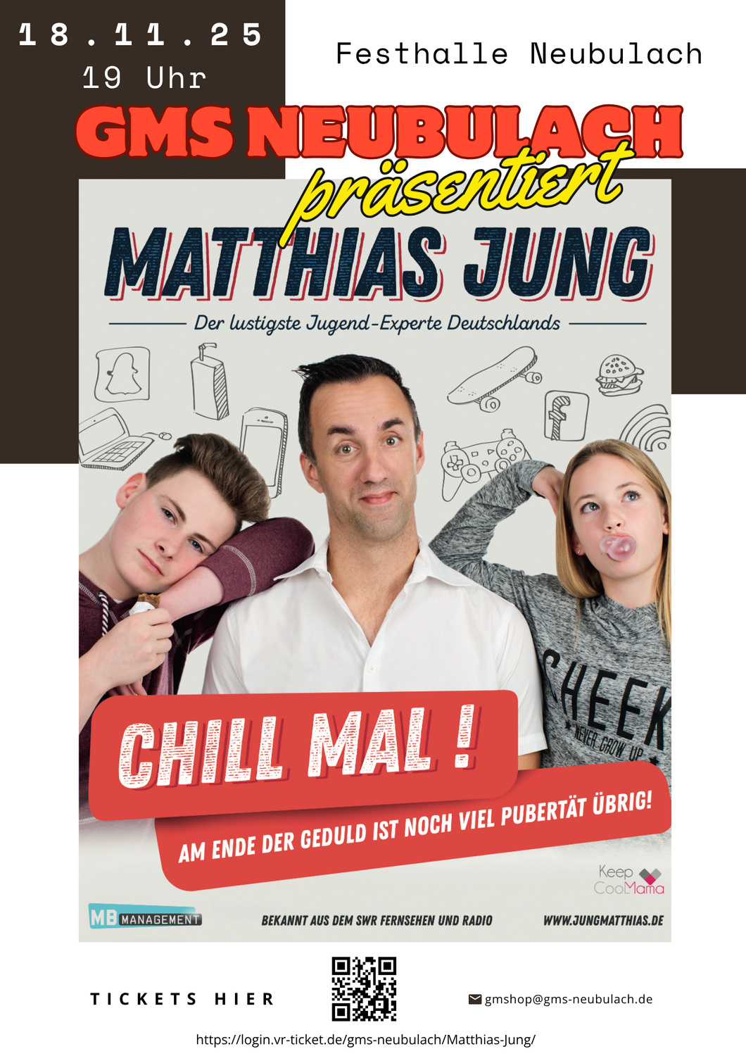 Matthias Jung ist seit 2005 eine feste Größe auf den Bühnen Deutschlands. Er hat regelmäßig TV-Auftritte, er hält Vorträge und gibt Coachings und Seminare. Er ist Leiter der größten Pubertäts- Facebook-Gruppe "Keep Cool Mama", in der 15.000 Mütter im ständigen Dialog die Probleme der Pubertät analysieren und er produzierte den erfolgreichen Podcast "Chill mal - Der Pubertäts AllTalk".