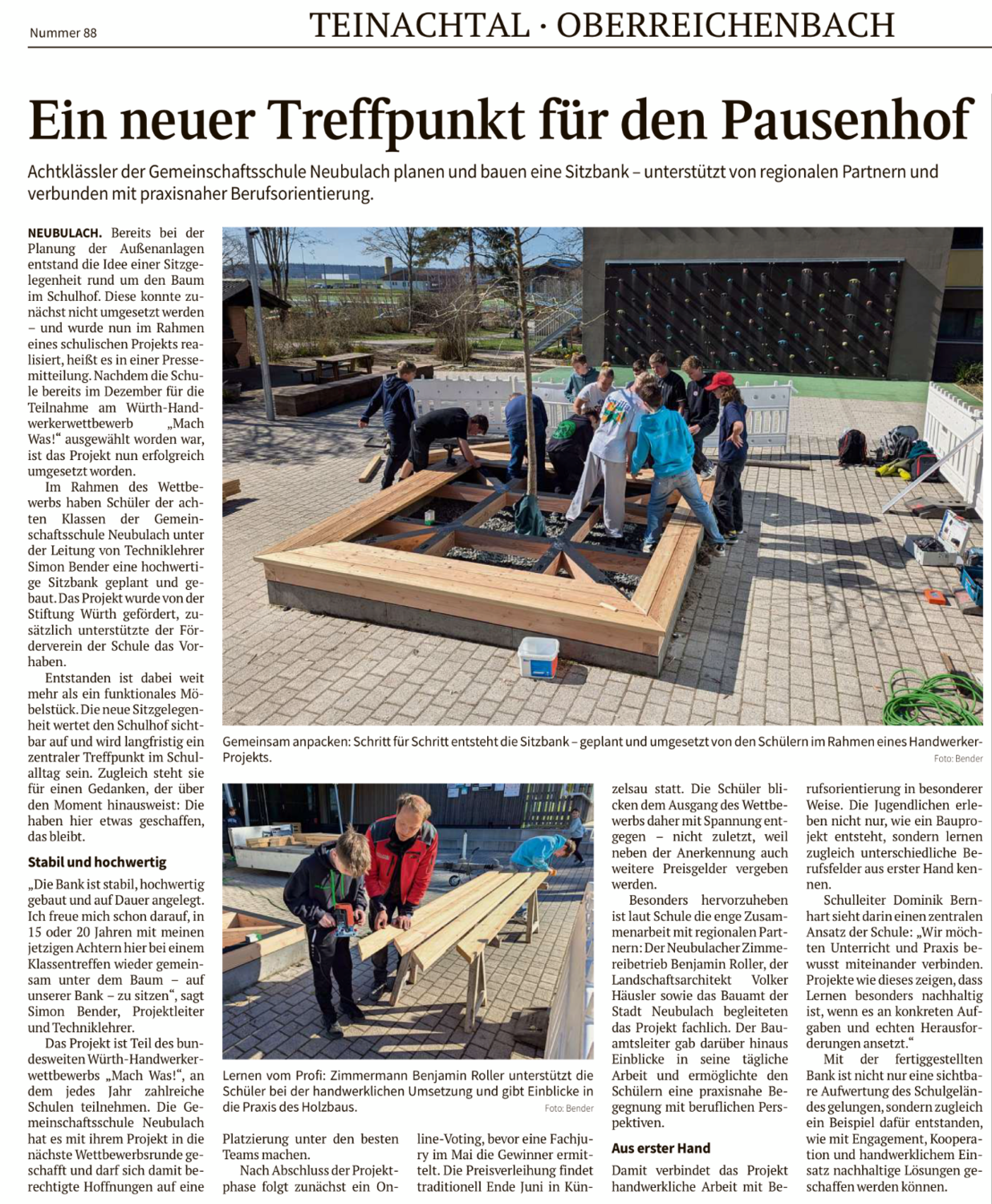 - Die Sitzbank im Schulhof ist fertig: Der Wettbewerbsbeitrag der Achter zum Würth Handwerkswettbewerb kann sich sehen lassen - und man kann sehr gut darauf sitzen ➔ Hier geht es zum Bericht im SchwaBo vom 17.04.2026