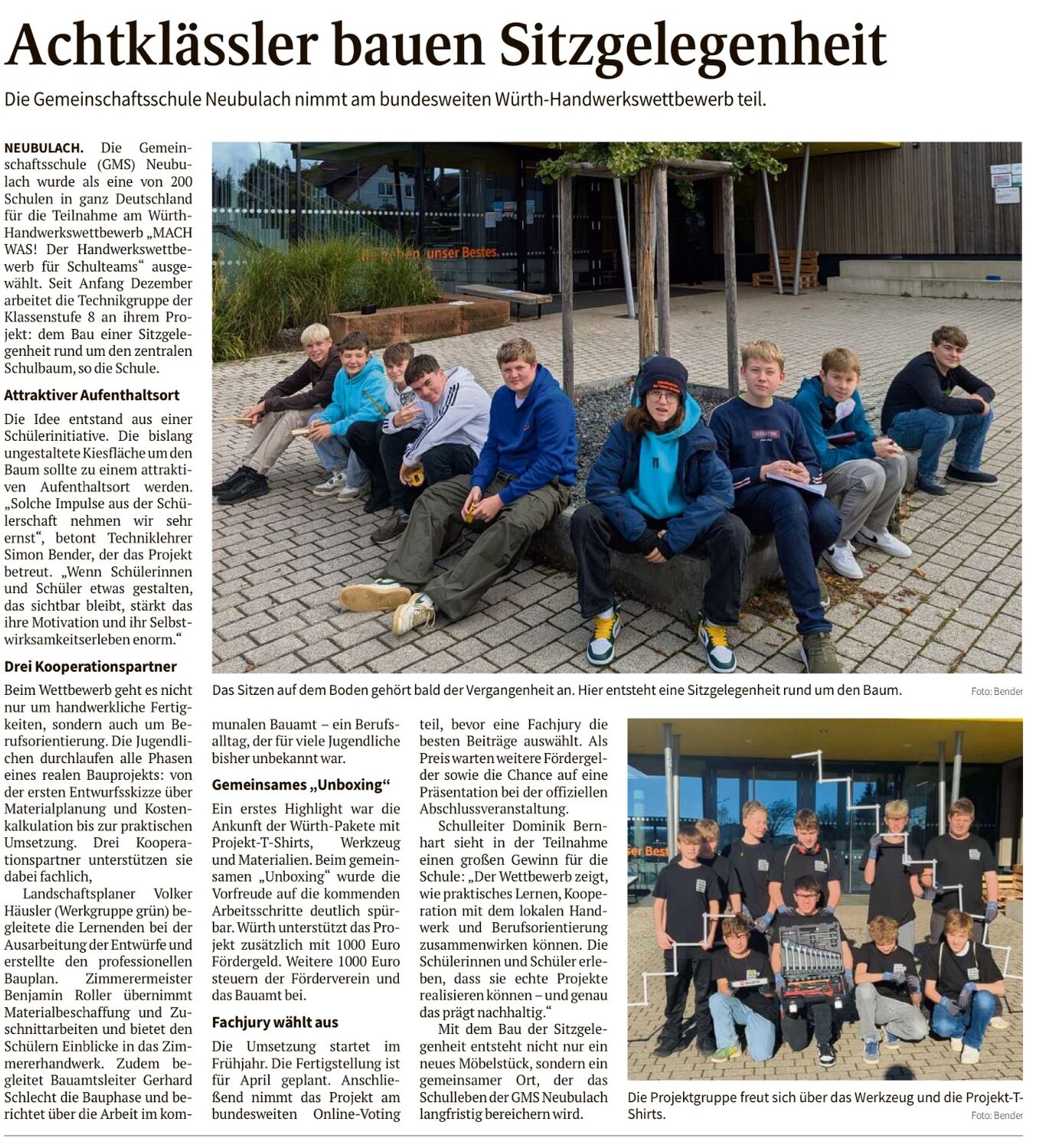 Die Gemeinschaftsschule Neubulach wurde als eine von nur 200 Schulen in ganz Deutschland für die Teilnahme am Würth-Handwerkswettbewerb „MACH WAS! Der Handwerkswettbewerb für Schulteams“ ausgewählt. Seit Anfang Dezember arbeitet die Technikgruppe der Klassenstufe 8 an ihrem Projekt: dem Bau einer Sitzgelegenheit rund um den zentralen Schulbaum.