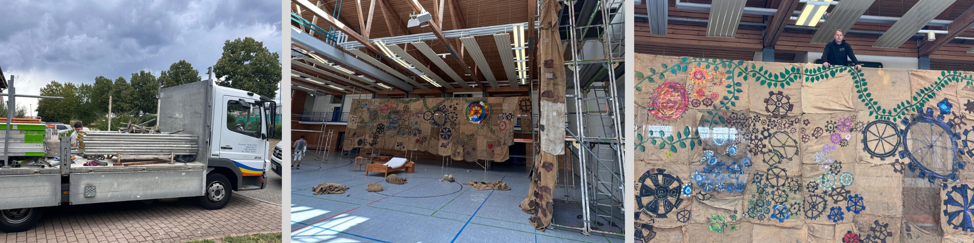 Zunächst einmal sind wir der Stadt Neubulach sehr dankbar, dass wir für das Musical ausnahmsweise die große Sporthalle nutzen durften. Angesichts der Größe des Projektes wäre eine Aufführung in der Festhalle allerdings undenkbar gewesen. Nach der Freude über die Erlaubnis standen wir allerdings vor jeder Menge praktischer Probleme. Die Sporthalle verfügt weder über Veranstaltungstechnik, noch gibt es eine Möglichkeit sie zu verdunkeln. Dies war aber notwendig, weil durch die hohen Glasfronten und das Glasdach die Beleuchtungstechnik nicht zur Geltung gekommen wäre. Hier gilt ein großer Dank dem Bauamt der Stadt Neubulach, insbesondere an Tino Mäder, der mit uns tatkräftig und kreativ nach Lösungen gesucht hat. Ein großer Dank gilt auch Holzbau Benjamin Roller, der uns bei der Abdunkelung mit einem fahrbaren Gerüst unterstützt hat. Vor allem unser Hausmeister Justin Unterricker und unser Kollege Christian Zachrich (der an beiden Veranstaltungen auch für die Lichttechnik verantwortlich war) haben hierfür schier Unglaubliches geleistet – und für alle „Problemzonen“ Lösungen gefunden bzw. gebaut: Von der Verdunkelung, des Glasdaches und der Glasfassade über die Installation von Bühnenbild und der Bühnentechnik bis hin zur Einrichtung einer tragfähigen Starkstromversorgung. Vielen herzlichen Dank dafür!