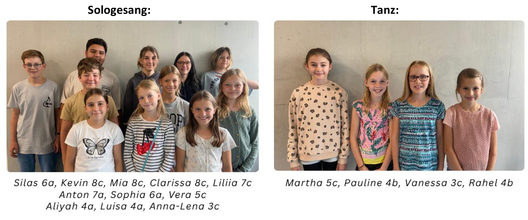 Der Sologesang und die damit verbundene Stimmbildung wurde von unserer Kollegin Sabine Cremonesi betreut – ausgebildete Musikerin mit dem Hauptfach Gesang, die mit fachlicher Kompetenz und Feingefühl viele Stimmen zum Klingen gebracht hat.