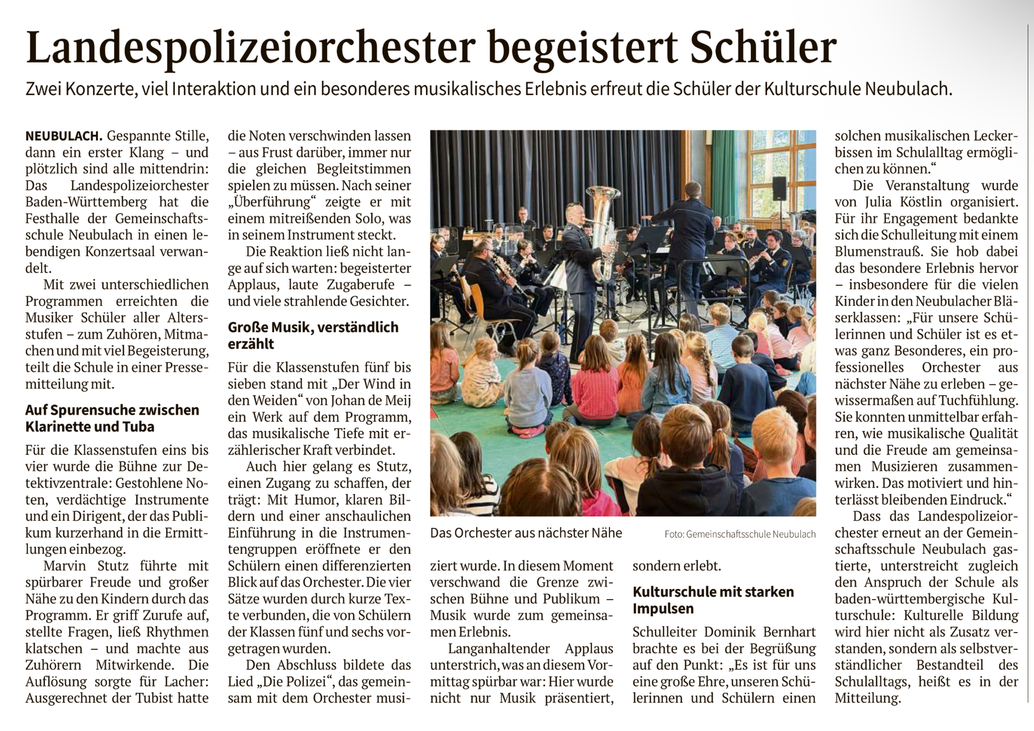 Dass das Landespolizeiorchester erneut an der Gemeinschaftsschule Neubulach gastierte, unterstreicht zugleich den Anspruch der Schule als baden-württembergische Kulturschule: Kulturelle Bildung wird hier nicht als Zusatz verstanden, sondern als selbstverständlicher Bestandteil des Schulalltags.
