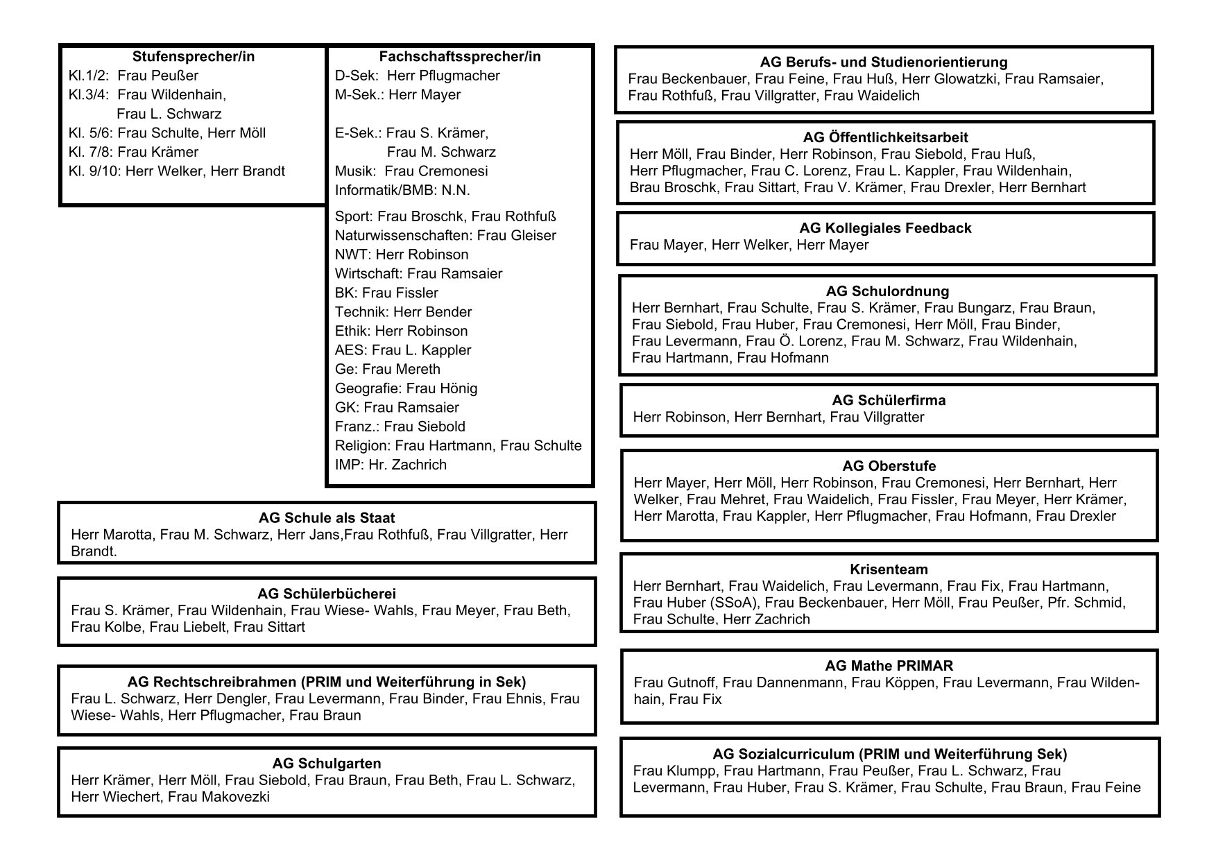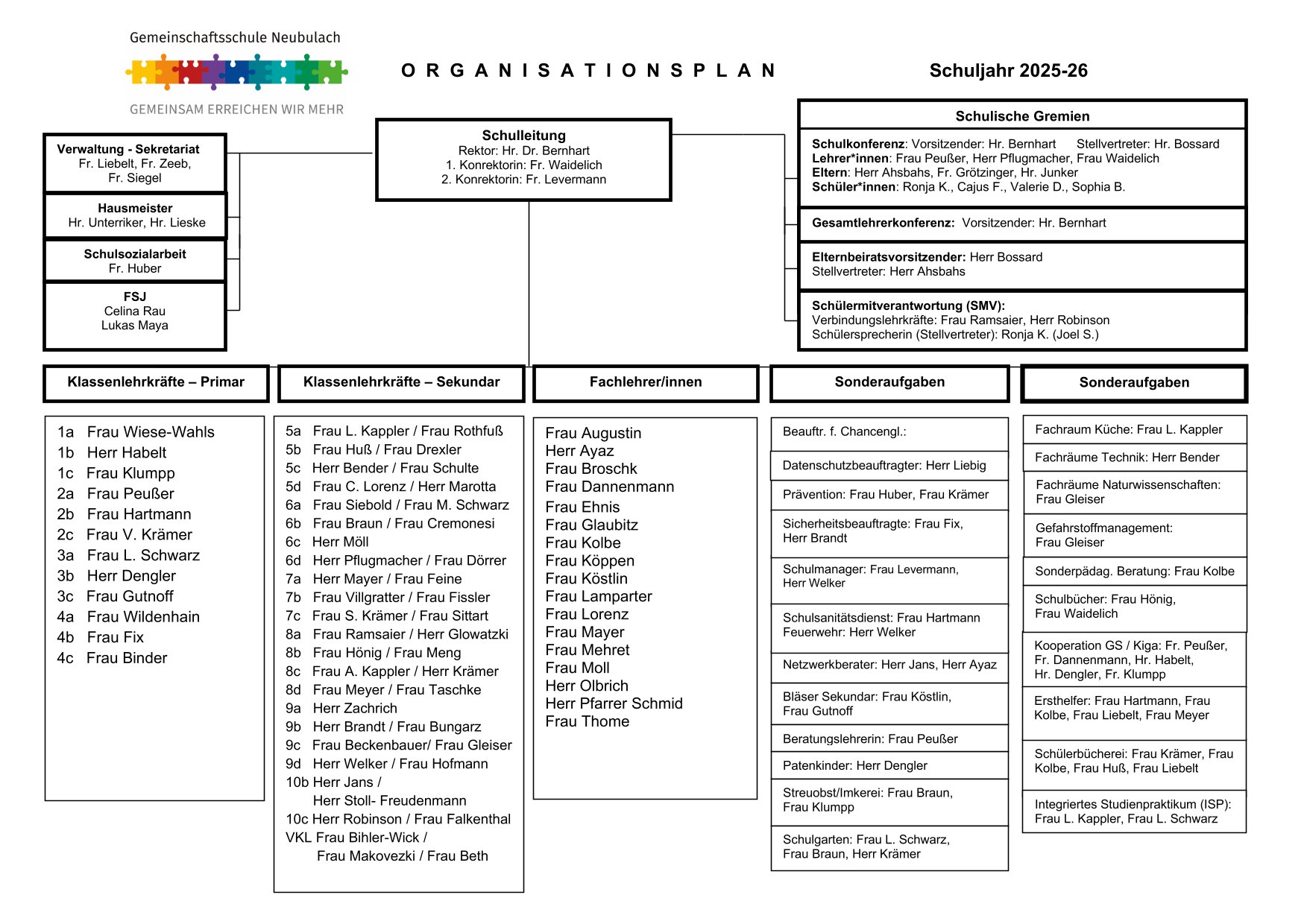 Das nachfolgende Organigramm beschreibt überblicksartig die verschiedenen Aufgaben und Zuständigkeiten an unserer Schule (Stand November 2025).