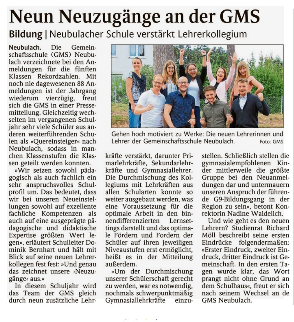 - Neue Kollegen an der GMS stellen sich vor: ➔ https://www.schwarzwaelder-bote.de/inhalt.neubulach-neue-lehrkraefte-fuer-die-gemeinschaftsschule-neubulach.bc76def6-484e-4913-8dbd-78d560f95ea8.html (22.09.2019)